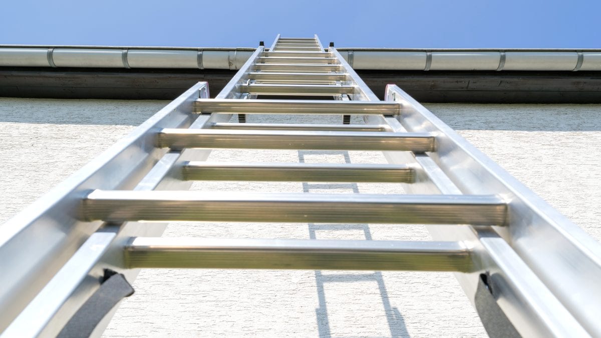 - Start by positioning the ladder: Place the ladder feet against the base of the building for stability. If there is not room to do this, you can place the feet of the ladder against another person’s feet.