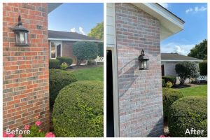 We thoroughly clean the surface using a bleach solution, detergent, and pressure washing to remove mold, mildew, dirt, and algae. Then we allow the brick to dry for at least two weeks before applying the whitewash.